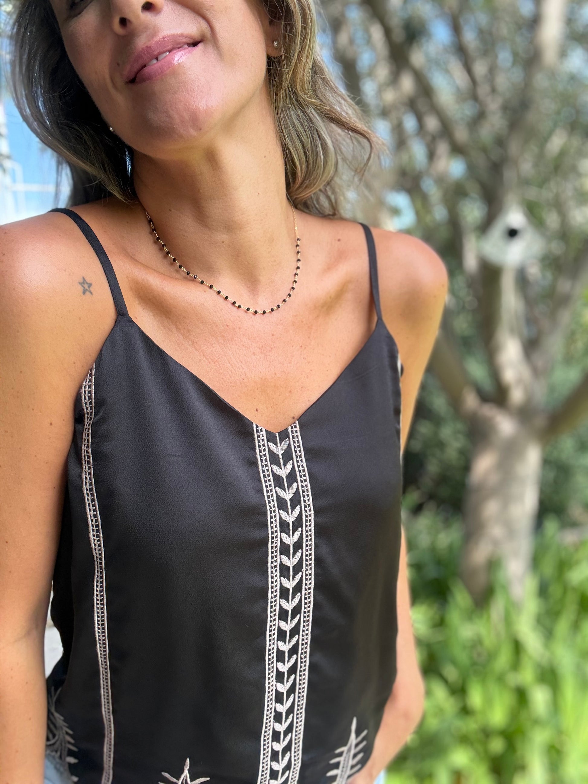Polera de simio seda con bordados. Tiritas ajustables.