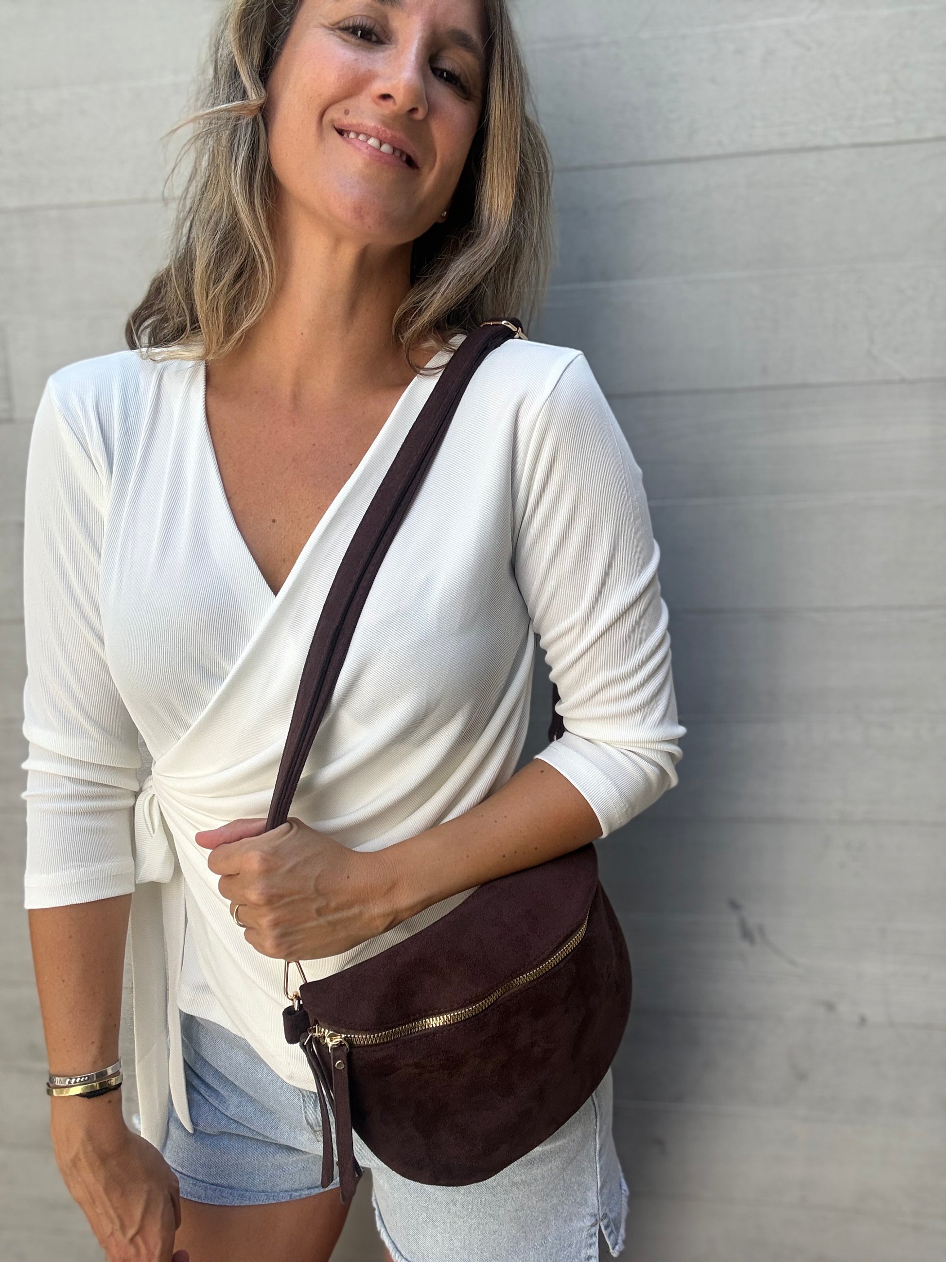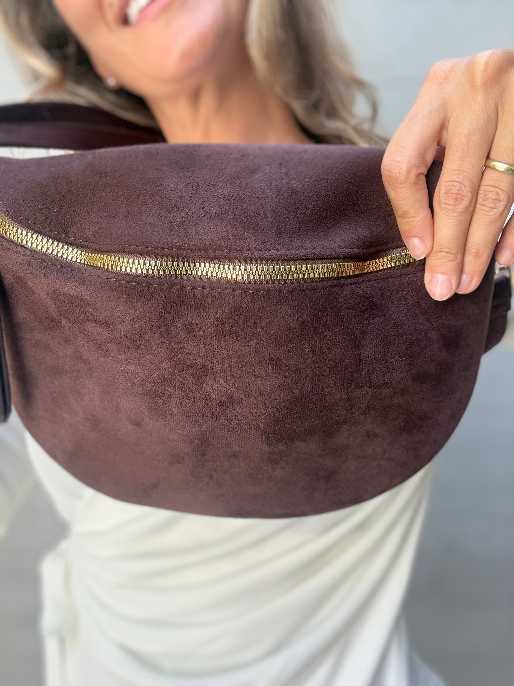 Riñonera de simil gamuza. Bolsllo interno. Cierres en dorado