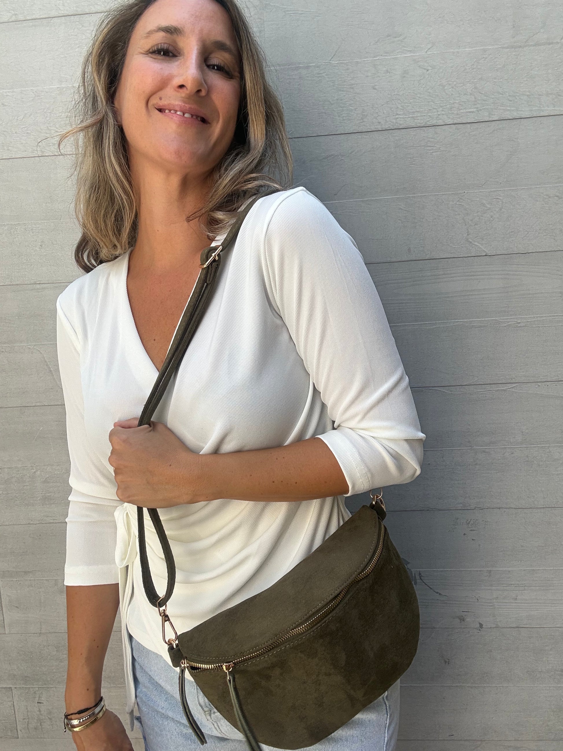 Riñonera de simil gamuza. Bolsllo interno. Cierres en dorado