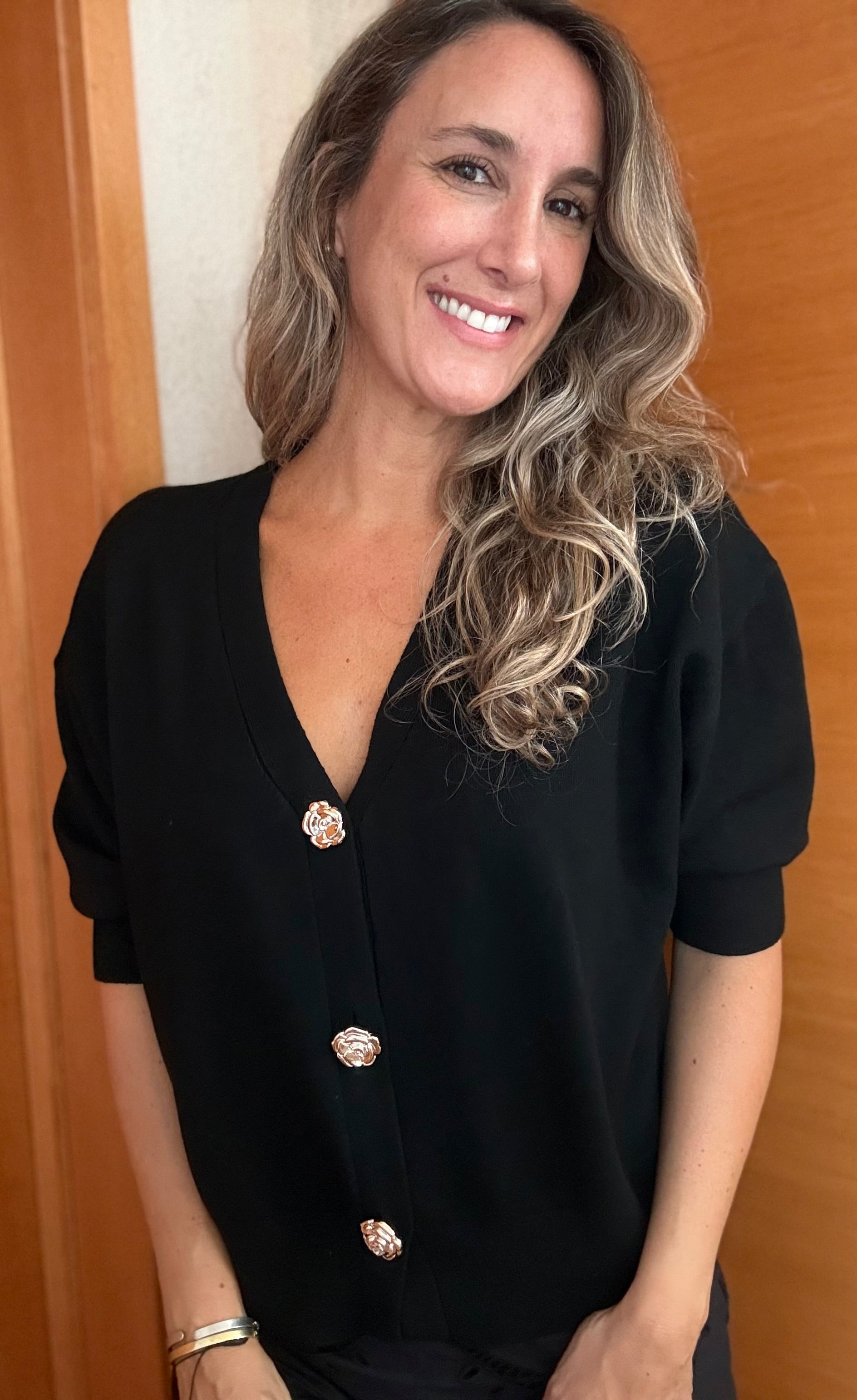 Sweater de Hilo suave. Botones con diseño de flor dorado